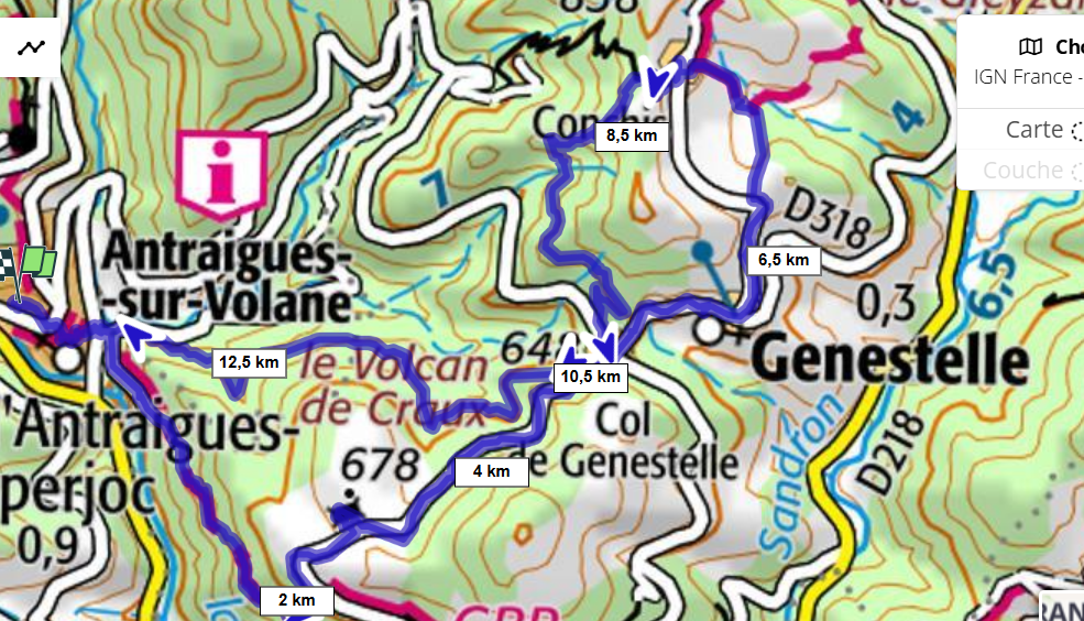 Genestelle – Antraigues 14,9 km Dénivelé +: 535m